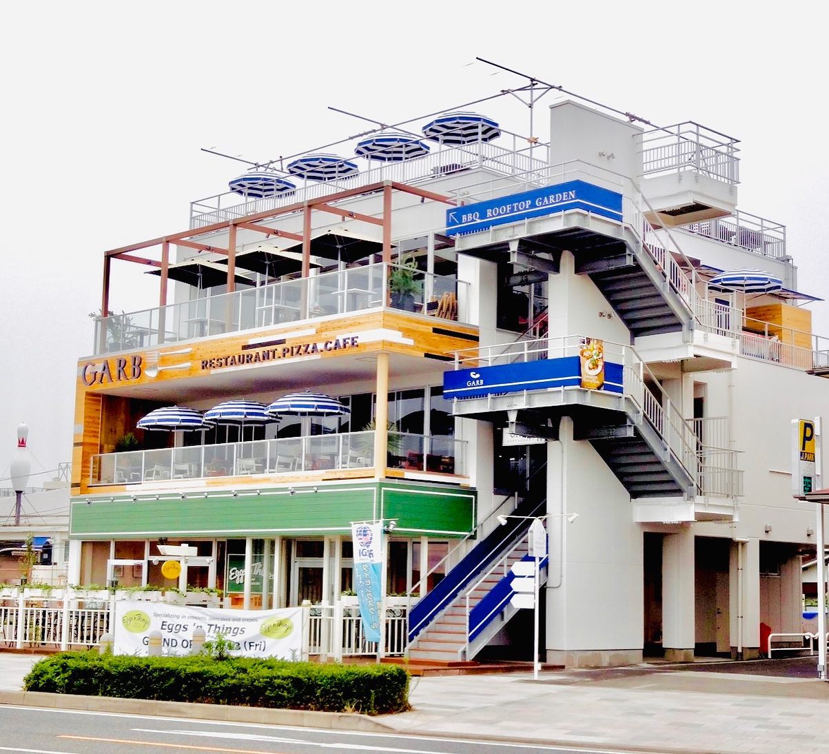 国道134号沿線沿いのTHE BEACH HOUSEの2・3階と屋上がレストラン ガーブ。