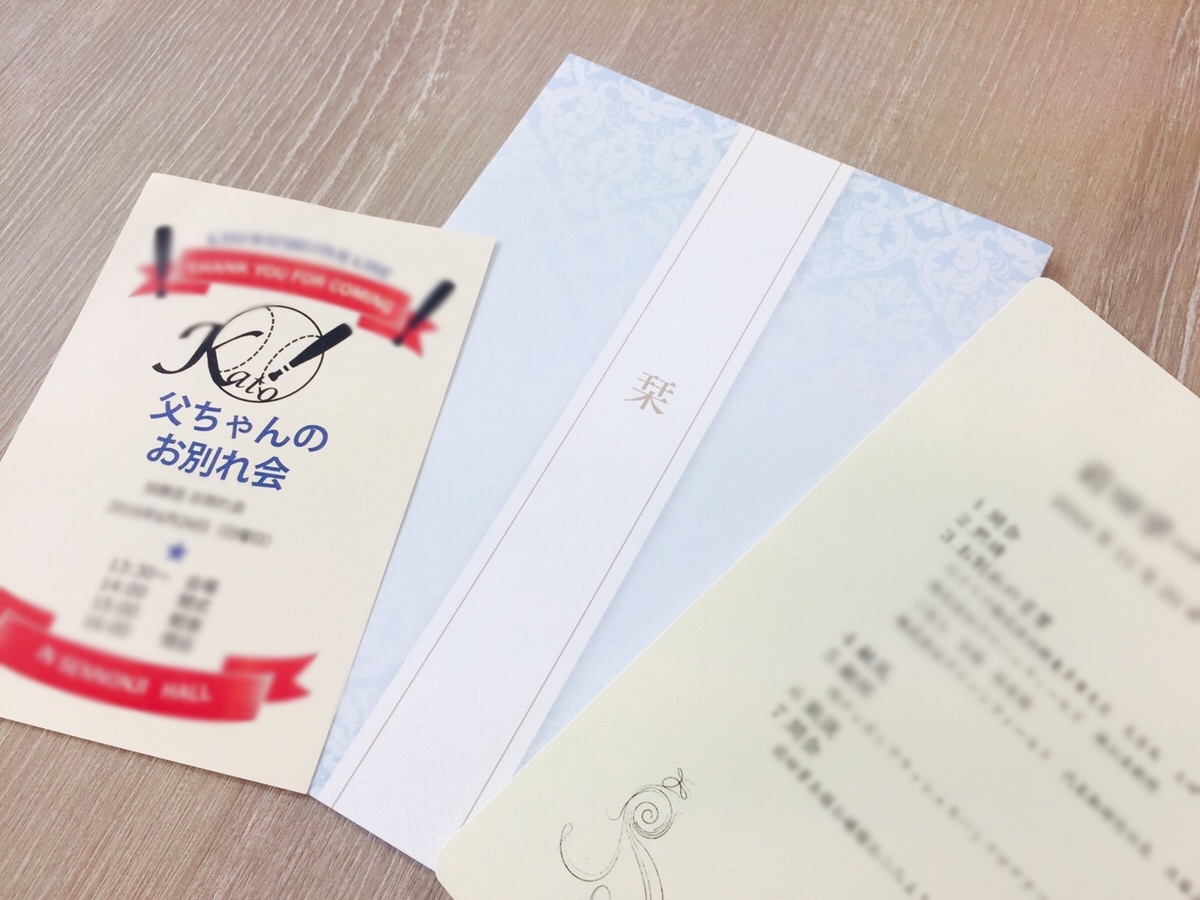 参列者に当日お渡しするカードです。お別れの会の概要や故人の略歴・挨拶などが入ります。